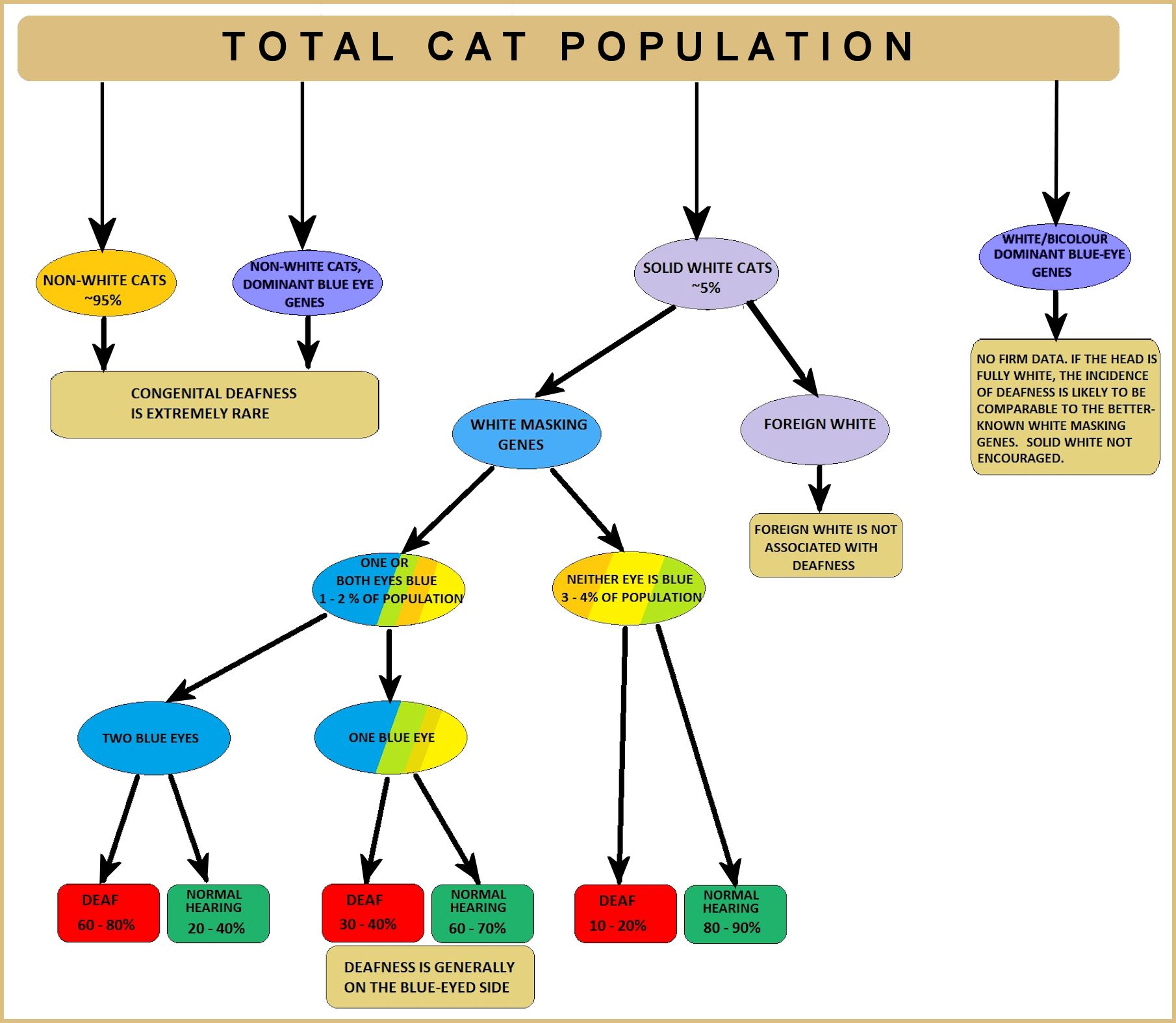 There is an established link between the white coat color, blue eyes and deafness. The tapetum lucidum is generated from the same stem cells as melanocytes (pigment cells). The blue eyes in a piebald or epistatic white cat indicates a lack of tapetum. Deafness is caused by an absence of a cell layer in the inner ear that originates from the same stem cells as well. In odd-eyed white cats, the ear on the blue-eyed side may be deaf, but the one on the orange-eyed side usually has normal hearing. Not all blue-eyed whites will be deaf since there are several different genes causing the same physical attributes (whiteness, blue-eyedness) so it all depends on the cat's genotype (its genetic make-up) not its phenotype (its physical appearance). Some people claim that 99% of blue-eyed white cats are deaf. This is inaccurate because blue-eyedness and whiteness can both be caused by different genes. It all depends on what genes the cat has inherited. These are the actual figures from scientific studies around the world. The percentages are given in ranges because results are different in different areas, partly because of the different genes found in the cat population. Where a cat is classed as deaf, the deafness may affect one or both ears.
