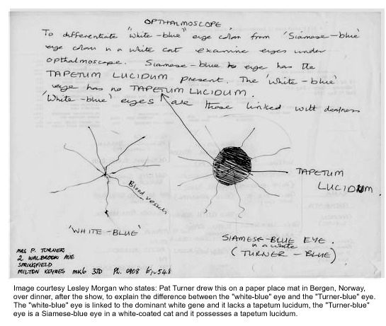 Patricia Turner planned the Foreign White breeding project in Great Britain starting in 1962. Along the way, this project confirmed that the blue eye normally seen in white cats were different to those in the Siamese and that the latter could be combined with the golden-eyed white crosses to give another type of blue. The varieties of blue eye were given the following names: